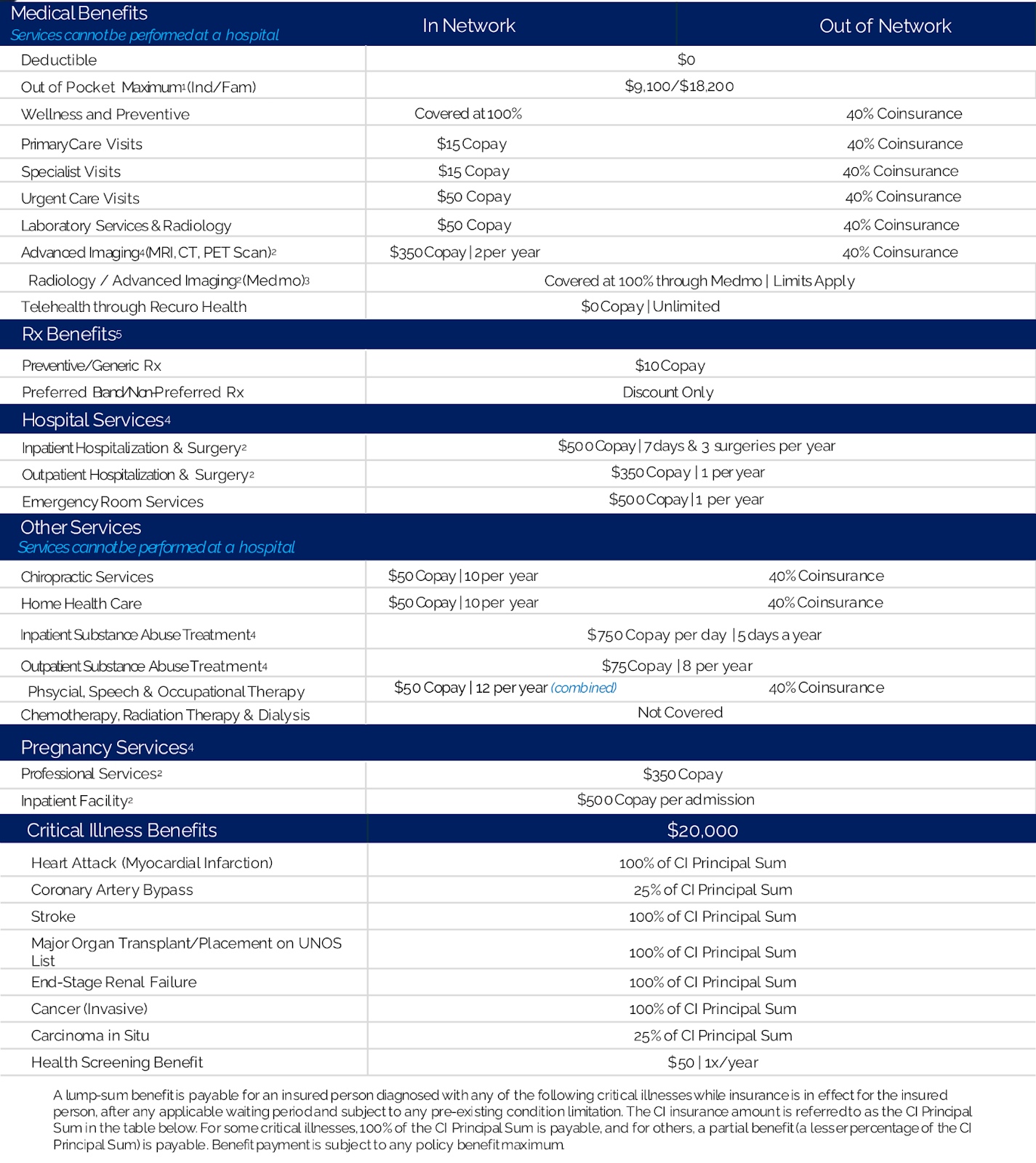Please Note: Please refer to the Schedule of Benefits and Description of Coverage for the official list of Benefits Coverage, Limitations, and Exclusions. If plan comparison above differs from the Schedule of Benefits and Description of Coverage, the Schedule of Benefits and Description of Coverage will govern.